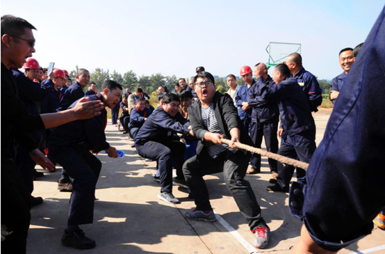 比賽場(chǎng)地設(shè)在辦公樓門前停車場(chǎng)。由各車間為單位,組成的12支代表隊(duì)參加了比賽,其中男隊(duì)8支女隊(duì)4支。比賽采用三局二勝制淘汰賽,每隊(duì)參賽人員 10人,按抽簽分組決定比賽順序。參賽隊(duì)員們個(gè)個(gè)摩拳擦掌、士氣高昂,隨著裁判員一聲哨響,比賽正式開始。隊(duì)與隊(duì)之間是一場(chǎng)力量和技術(shù)的較量,上場(chǎng)的兩支參賽隊(duì)伍緊握拔河繩,心往一處想,勁往一處使,拼勁全力,展開了實(shí)力拉鋸戰(zhàn)。賽場(chǎng)下,啦啦隊(duì)員們?yōu)樽约褐С值年?duì)伍加油鼓勁,助威聲一浪高過(guò)一浪。隊(duì)員們?cè)谫悎?chǎng)上的精彩表現(xiàn)搏得了現(xiàn)場(chǎng)觀眾的陣陣歡呼,號(hào)子聲、吶喊聲,此起彼伏,高潮迭起,氣氛熱烈。